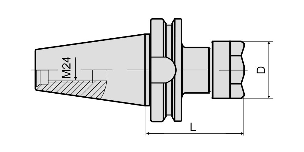 Фрезерный патрон BT50-ER16-160 (MAS 403, JIS B 6339) обеспечивает надежную фиксацию режущего инструмента с цилиндрическим хвостовиком в шпинделе станка и используется в сверлильных, фрезерных станках с ЧПУ, обрабатывающих центрах. Фиксация инструмента в корпусе патрона осуществляется при помощи зажимной цанги ER16 (DIN 6499) и гайки типа A. В зависимости от размера отверстия цанги в патрон устанавливается инструмент с хвостовиком диаметром от 1 до 10 мм. Крепление оправки в шпинделе производится при помощи штревельного болта M24, который не входит в комплект поставки и приобретается дополнительно. Тип подачи СОЖ: АD (через центральное отверстие). Вылет патрона от шпинделя станка составляет 160 мм.
