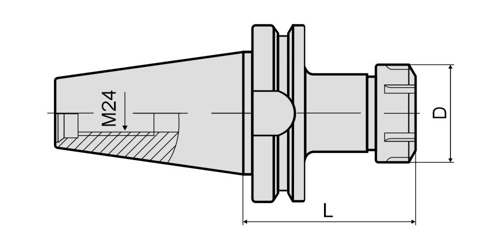 Фрезерный патрон BT50-ER40-150 (MAS 403, JIS B 6339) обеспечивает надежную фиксацию режущего инструмента с цилиндрическим хвостовиком в шпинделе станка и используется в сверлильных, фрезерных станках с ЧПУ, обрабатывающих центрах. Фиксация инструмента в корпусе патрона осуществляется при помощи зажимной цанги ER40 (DIN 6499) и гайки типа UM. В зависимости от размера отверстия цанги в патрон устанавливается инструмент с хвостовиком диаметром от 3 до 26 мм. Крепление оправки в шпинделе производится при помощи штревельного болта M24, который не входит в комплект поставки и приобретается дополнительно. Тип подачи СОЖ: АD (через центральное отверстие). Вылет патрона от шпинделя станка составляет 150 мм.