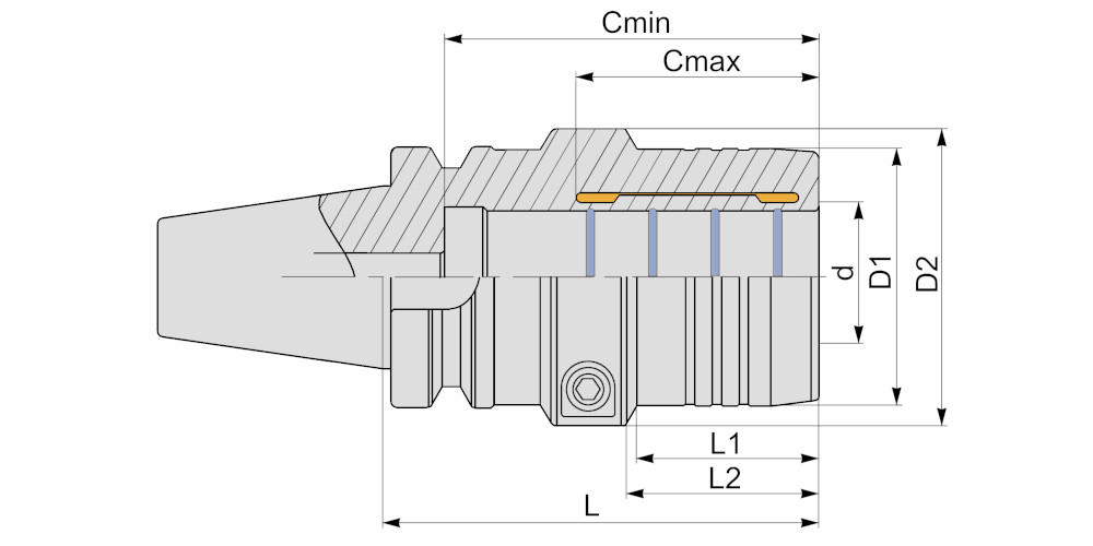Фрезерный гидропластовый патрон BT50-HDC32-120 обеспечивает надежную фиксацию режущего инструмента с цилиндрическим хвостовиком в шпинделе станка. Фиксация инструмента в патроне осуществляется за счет увеличения давления жидкости в специальной полости при помощи регулировочного винта. Номинальный диаметр хвостовика зажимаемого инструмента 32 мм с допуском h6.