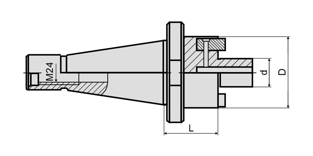 Фрезерный патрон NT50-FMB27-100 (DIN 2080, ISO 7388/1) предназначен для фиксации торцевой насадной фрезы с диаметром посадочного отверстия 27 мм, используется в универсальных фрезерных станках (без ЧПУ). Установка фрезы в оправку производится затяжным винтом. Крепление патрона в шпинделе производится при помощи штревельного болта M24, который не входит в комплект поставки и приобретается дополнительно. Вылет патрона от шпинделя станка составляет 100 мм.