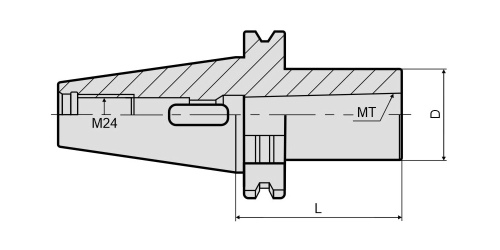 Патрон SK50-MTA4-095 предназначен для фиксации сверла с хвостовиком Морзе MTA4 (конус Морзе №4). Конструкция оправки позволяет его использовать на оборудовании с автоматической сменой режущего инструмента (фрезерные станки с ЧПУ, обрабатывающие центры). Хвостовик SK50 c конусностью 7:24 (DIN 69871, ISO 7388/1) надежно фиксируется в шпинделе станка штревельным болтом с резьбой M16 (в комплект поставки не входит). Тип подачи СОЖ: AD (через центральное отверстие). Вылет патрона от шпинделя станка составляет 95 мм.