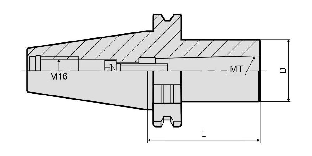Патрон SK40-MTB2-050 предназначен для фиксации фрезы с хвостовиком Морзе MTB2 (конус Морзе №2). Конструкция оправки позволяет его использовать на оборудовании с автоматической сменой режущего инструмента (фрезерные станки с ЧПУ, обрабатывающие центры). Хвостовик SK40 c конусностью 7:24 (DIN 69871, ISO 7388/1) надежно фиксируется в шпинделе станка штревельным болтом с резьбой M16 (в комплект поставки не входит). Патрон оснащен внутренним болтом М10, который применяется для затягивания и фиксации инструмента. Конструкция без подачи СОЖ (тип A). Вылет патрона от шпинделя станка составляет 50 мм.