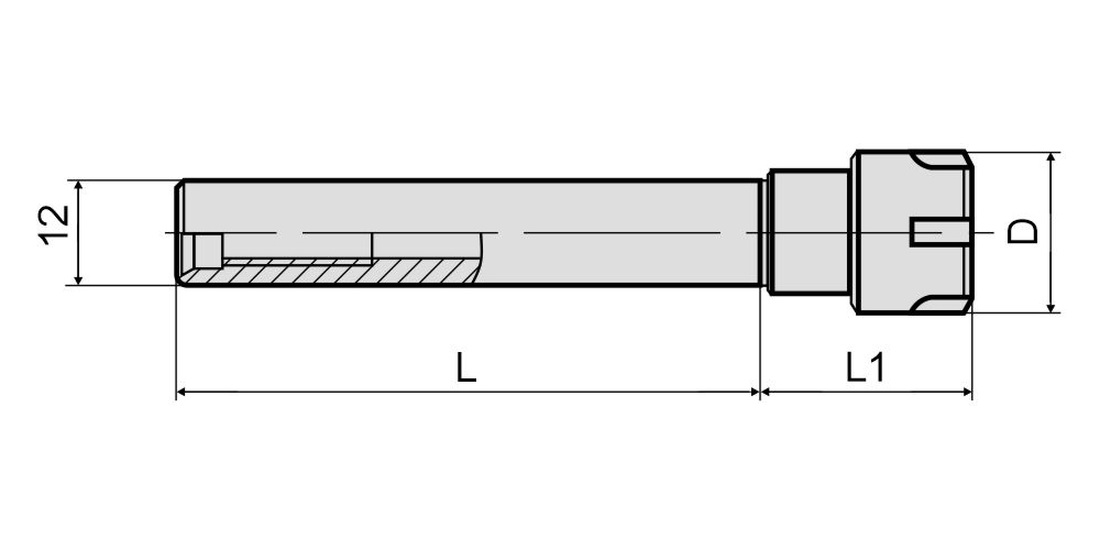 Фрезерный патрон C12-ER16M-100 (DIN 6535 HA / ISO 3338) используется в условиях большого вылета инструмента или ограниченного доступа к зоне резания. Цилиндрический хвостовик оправки фиксируется в цанговом зажиме большего размера или патроне Weldon (при наличии специальной лыски на хвостовике). Установка режущего инструмента в корпус патрона осуществляется при помощи зажимной цанги ER16 (DIN 6499) и гайки типа M. В зависимости от размера отверстия цанги в патрон устанавливается инструмент с цилиндрическим хвостовиком диаметром от 1 до 10 мм. Длина хвостовика патрона составляет 100 мм.