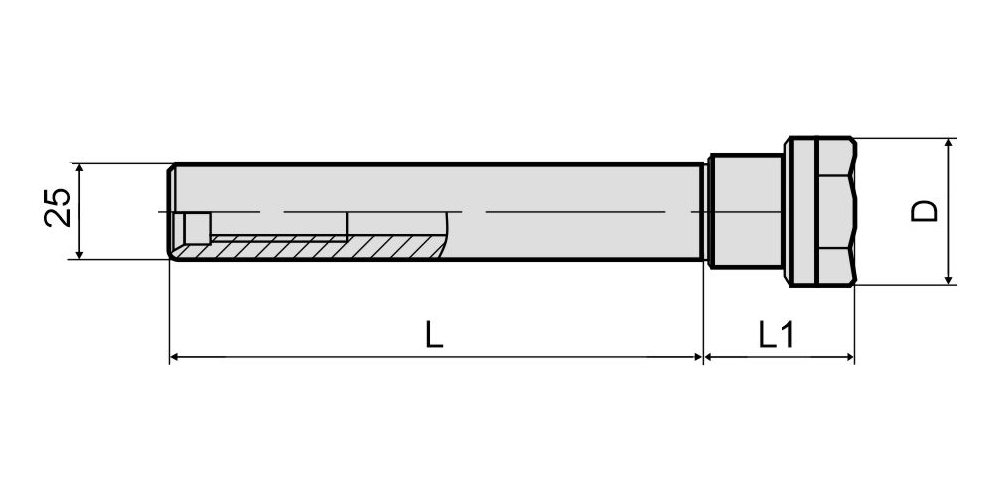 Фрезерный патрон C25-ER16-100 (DIN 6535 HA / ISO 3338) используется в условиях большого вылета инструмента или ограниченного доступа к зоне резания. Цилиндрический хвостовик оправки фиксируется в цанговом зажиме большего размера или патроне Weldon (при наличии специальной лыски на хвостовике). Установка режущего инструмента в корпус патрона осуществляется при помощи зажимной цанги ER16 (DIN 6499) и гайки типа A. В зависимости от размера отверстия цанги в патрон устанавливается инструмент с цилиндрическим хвостовиком диаметром от 1 до 10 мм. Длина хвостовика патрона составляет 100 мм.