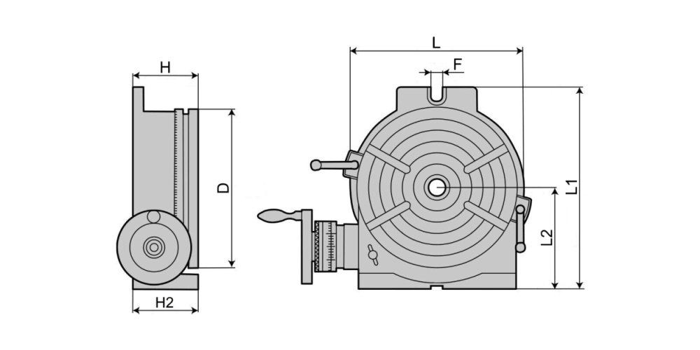 Поворотный стол HV-6 используется для поворота заготовки, установки углов кругового фрезерования, сверления, торцевания и т.д. Конструкция стола предусматривает горизонтальную и вертикальную установку, в том числе с применением задней бабки ТS. Диаметр планшайбы 150 миллиметров. На рабочей поверхности планшайбы расположены четыре Т-образных паза шириной 10 миллиметров и сквозное отверстие под конус Морзе №2 (MT2). Угол схождения Т-образных пазов 90°. Передаточное число червячной пары 1:90, за один оборот маховика планшайба поворачивается на 4°.