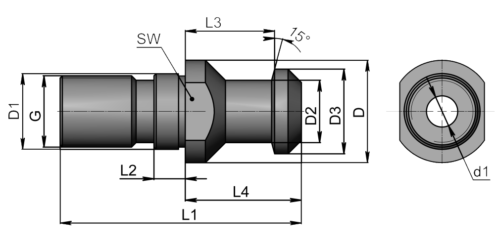 Штревель DIN69872 для фрезеного патрона SK40 (DIN 69871, ISO 7388-1, ГОСТ 25827 исп. 2). С проходным отверстием для подачи СОЖ. Без уплотнительного кольца.