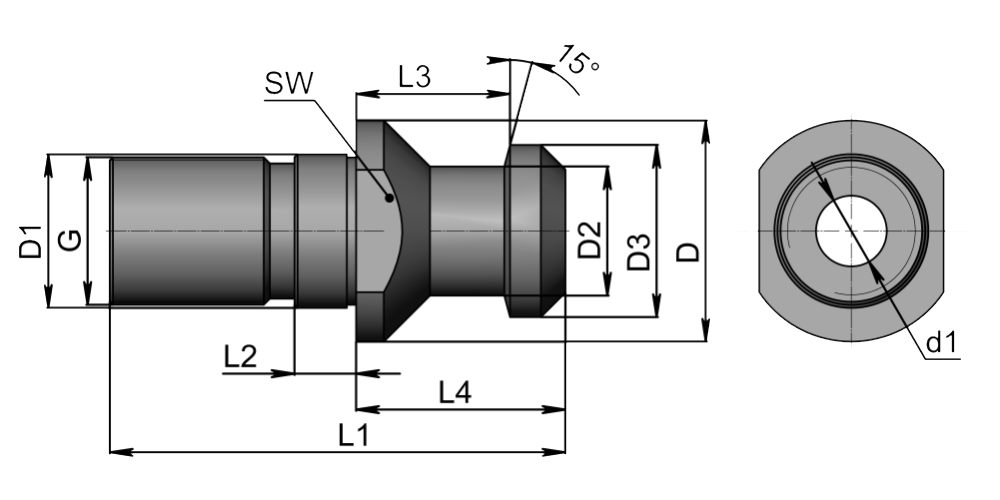 Штревель DIN69872 для фрезеного патрона SK50 (DIN 69871, ISO 7388-1, ГОСТ 25827 исп. 2). С проходным отверстием для подачи СОЖ. Без уплотнительного кольца.