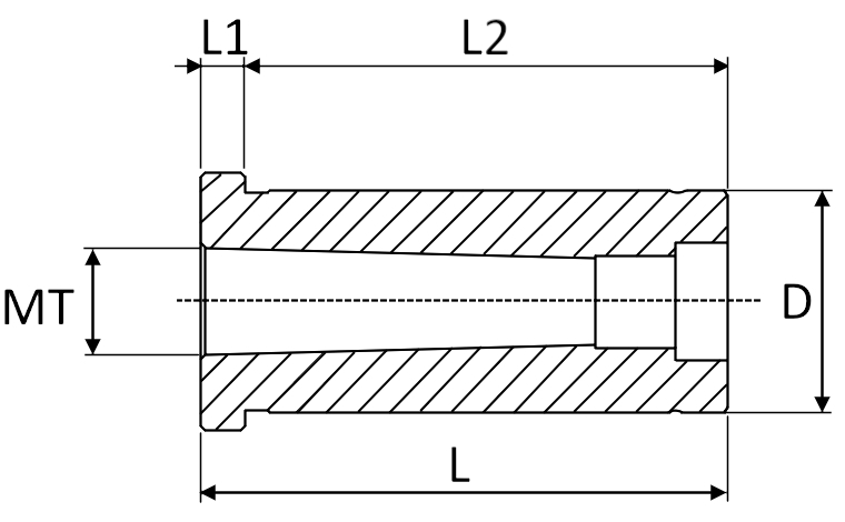 Переходная втулка D60-MT5 предназначена для фиксации режущего инструмента с хвостовиком Морзе. Используется для перехода с цилиндрического хвостовика на конус Морзе. Диаметр хвостовика втулки - 60 мм, размер хвостовика устанавливаемого инструмента - MT5 (конус Морзе №5).