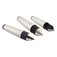 Вращающиеся центры серии HD43 и LC-ICP изготовлены из закаленной легированной стали, используются для фиксации и точного базирования заготовки при токарной на высокоскоростных режимах резания. Конструкция центра состоит из хвостовика в виде конуса Морзе и вращающегося сменного конусовидного упора. Вращение упора осуществляется при помощи шариковых подшипников, встроенных в корпус оснастки. Сменные вставки позволяют оперативно изменить конфигурацию токарного центра в соответствии с выполняемой операцией. В комплект поставки входят шесть вставок различного форм-фактора.