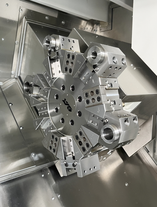 РНАЯ ГОЛОВКА Станки данной серии комплектуются револьверной головкой на 12 позиций инструмента. Исполнение - без приводного инструмента, с подачей СОЖ непосредственно через головку и инструмент. Смена позиций инструмента выполняется сервоприводом с фиксацией гидрозажимом для обеспечения плавного хода, надежности и жесткости даже в условиях повышенных нагрузок на режущий инструмент. В комплекте с револьверной головкой поставляются:
